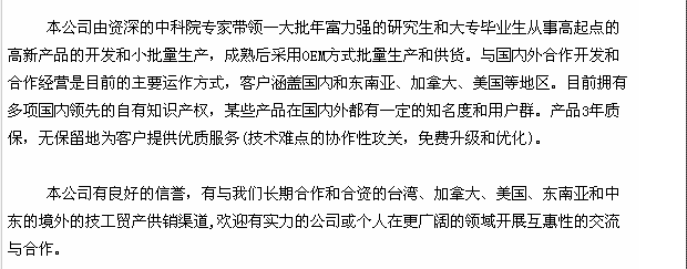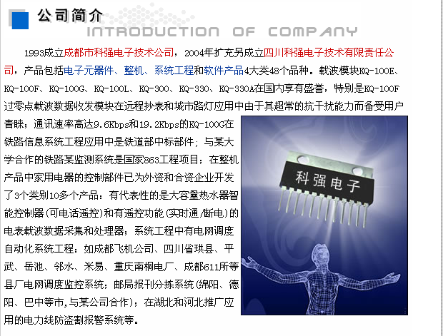 四川科强电子技术有限责任公司成立于2004年。公司是由多名专业高级工程师、中青年工程技术人员组成的研发团队。公司秉承“科技创造文明,知识造福人类”的宗旨,致力于低温仪表技术,电力载波通信技术,电力自动化技术以及深冷应用技术产品的研发、生产。先后开发了以KQ-100,KQ-300,KQ-330载波通信模块等系列核心的主导产品,主要应用于电力、铁路、税控、路灯控制、家庭智能化等领域;开发出的深冷处理工模具的KQS-系列专用设备,先后为东方电气集团有限公司的风电部、重装部、透平事业部等部门所使用,解决了企业之忧。
